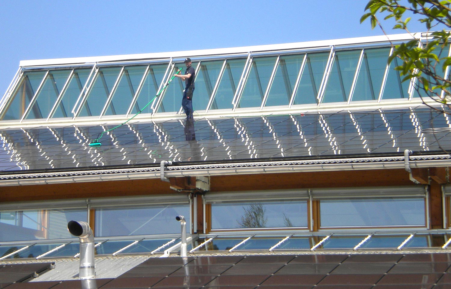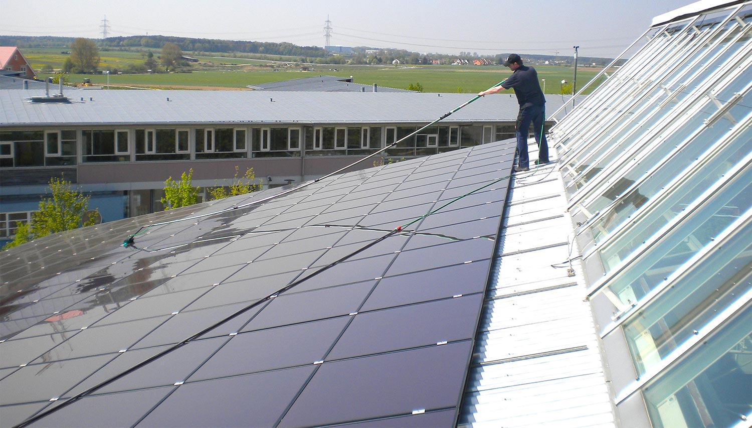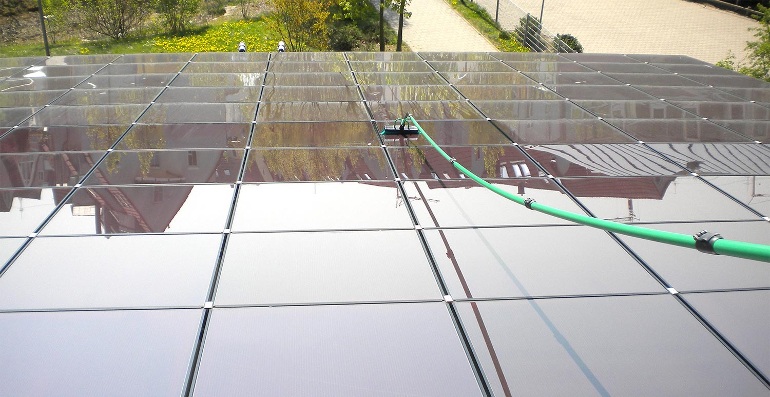 Ihre Photovoltaik- oder Solarthermische Anlage reinigen wir mit professionellem Equipment. Unsere Umkehrosmosegeräte filtern die im Wasser enthaltenen Salze, Metalle und Kalk zu 99,99 Prozent heraus. Dieses Entmineralisiertes Wasser ist besonders Aufnahmefähig für Schmutz. Verschmutzungen verbinden sich mit dem Wasser und es entstehen bei der Abtrocknung keine Rückstände oder Streifen. Zusammen mit den Wasserführenden Teleskopstangen und den speziell für die Reinigung von Photovoltaikanlagen entwickelten Reinigungsbürsten können wir Höhen von bis zu 16 Meter ohne Steighilfen erreichen. Diese Reinigungsmethode ist nicht nur effizient, sondern auch umweltschonend.